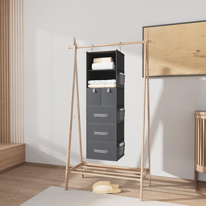 6-Shelves Hanging Closet Organizer with 5 Different Drawers, Foldable Organizers and Storage for Wardrobe, Closet& RV, Clothes and Accessories Storage, Non-woven fabric, Dark Gray
