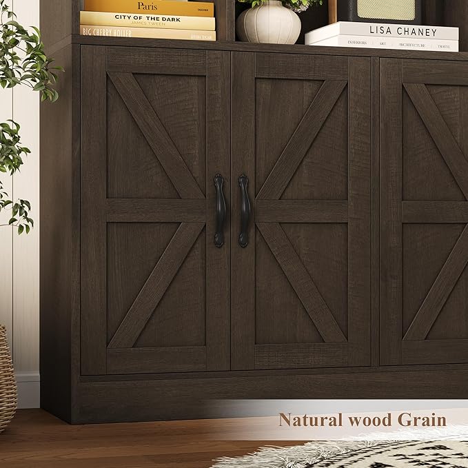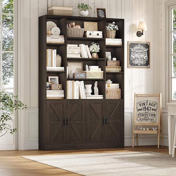 HOSTACK 75” Tall Book Shelf and Bookcase, Bookshelf with Storage Cabinet, 47” Wide Bookcase with 4 Doors, Standing Display Shelves, Modern Farmhouse Book Case for Living Room, Home Office, Dark Brown