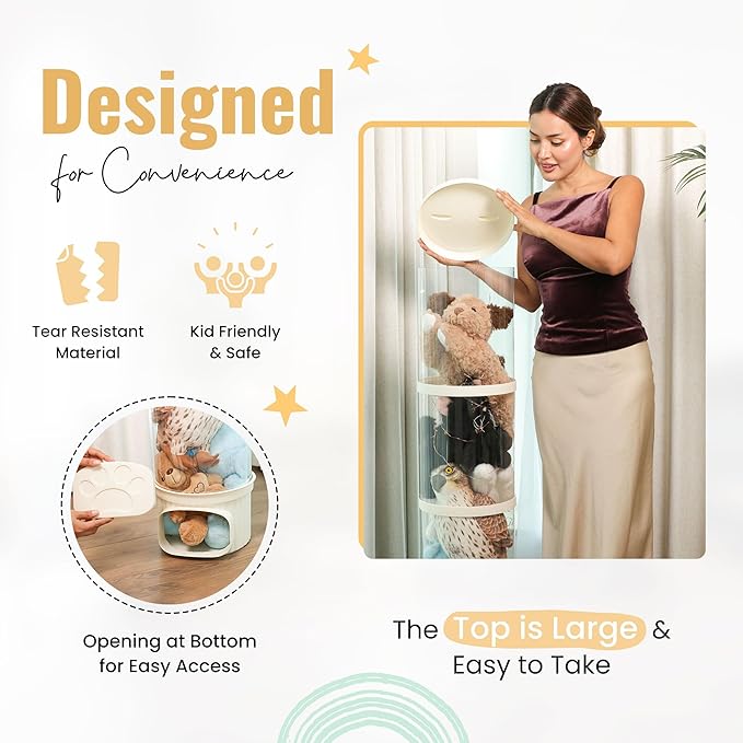 - {Bring Joy and Order to Your Home} – Say goodbye to messy rooms and hello to a tidy, cheerful space! With a size of 42 inches tall and 10 inches in diameter, this storage organizer holds up to 30 stuffed animals, keeping your child’s favorite toys neatly arranged and ready for playtime.