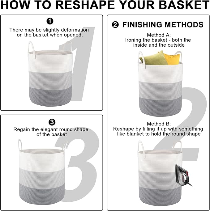 - Washable Woven Basket: This large basket can be washed by hand or machine with gentle detergent. If machine washed, please put them into a laundry bag. NOTE: These cotton rope baskets are folded when shipping, but it will turn back to its elegant shape quickly if you fill it with some towels or clothing, and iron is great idea to remove the creases