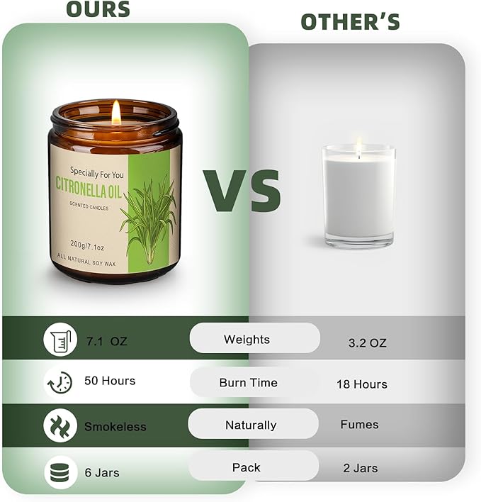 - Clean Burning: High purity citronella oil is extracted through a refined process and blended into naturally degradable soy wax. These vegan candles deliver a refreshing fragrance that is entirely free from paraffin and residues.