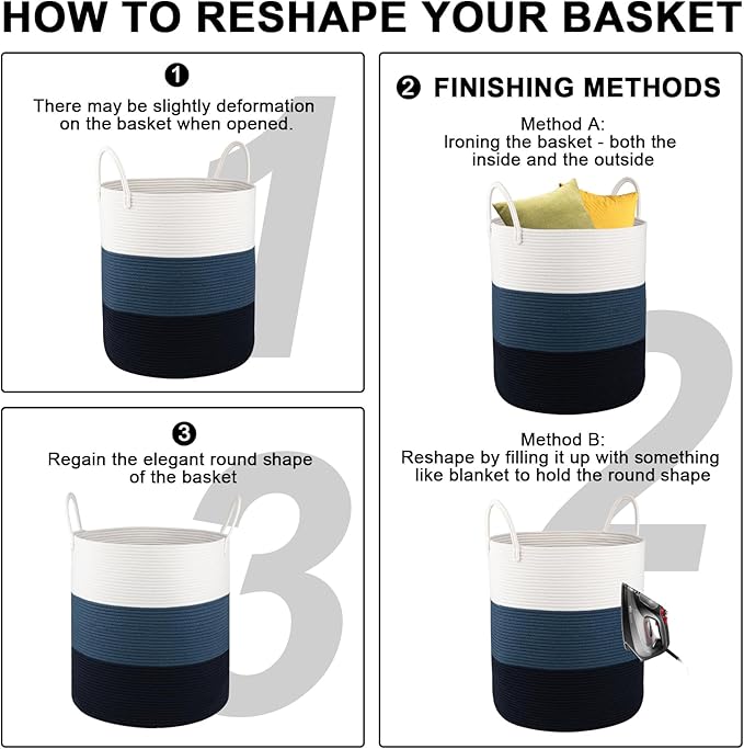 - Washable Woven Basket: This large basket can be washed by hand or machine with gentle detergent. If machine washed, please put them into a laundry bag. NOTE: These cotton rope baskets are folded when shipping, but it will turn back to its elegant shape quickly if you fill it with some towels or clothing, and iron is great idea to remove the creases