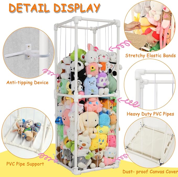 - 【Large Capacity Storage】Measuring 58 x 19 x 19 inches, this vertical storage solution offers plenty of room for up to 25 large or 100+ small plush toys. The compact design saves space while offering generous storage to keep your stuffed animals off the floor and neatly organized