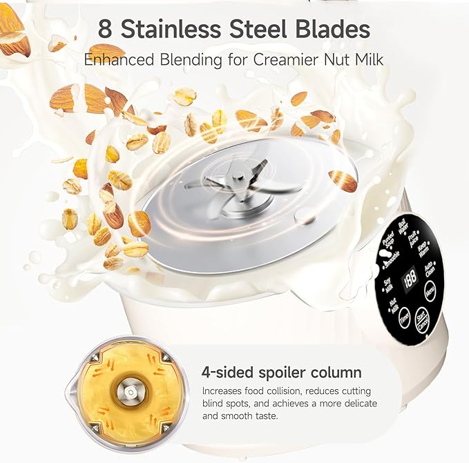 - 【Versatile 8-in-1 Functionality】: This is not just a soy milk maker, but also a multifunctional beverage making center. In addition to the classic full-nutritional soy milk, it can also make all kinds of delicious drinks, such as rich nut milk, delicate milkshake, delicious fruit juice, etc. Simply put the appropriate ingredients into the soy milk maker and select the corresponding mode, you can easily make your favorite drinks to meet the different taste needs of the whole family.