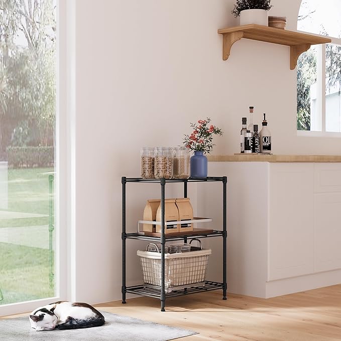 - 【Strong & Stable】Crafted from premium carbon steel, this 3 tier wire shelf offers outstanding strength and durability. With a total load capacity of 450 lbs, it functions perfectly as a pantry floor organizer, bakers rack, or kitchen storage shelf for tools, cookware, and daily essentials.