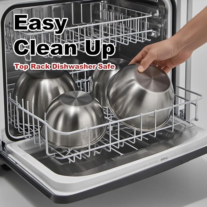 - [PREMIUM 304 STAINLESS STEEL BOWLS – FOOD SAFE & DURABLE] Crafted with food-grade 304 stainless steel featuring a mirror-polished, non-porous interior that resists stains and odors. Unlike plastic alternatives, these bowls are warp-resistant and dishwasher-safe for easy cleaning, ideal for baking, salads, and meal preparation