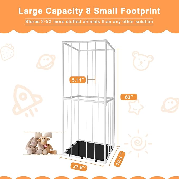 - [Easy Assembly and Installation]-- The elastic rope has been prewired into the pipe.Meanwhile,with detailed illustrations and an English instruction.This toy organizers and storage comes with detailed installation instructions, no extra accessories are needed.So you can build a stuffed animal kingdom in just 5 minutes