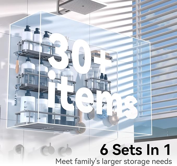 - Game Changer for Shower Storage: The 6-piece large capacity shower caddy set comes with 5 different storage solutions to match all your shower essentials, including large caddy X3 for large shampoo bottles, mini caddy X1 for small bottles, shower soap holder X1 for soap bar, little hook X 2 and a row of hooks for hanging razors, towels, loofahs and so on. It is a game changer for enhancing your bathroom space and simplifying your life