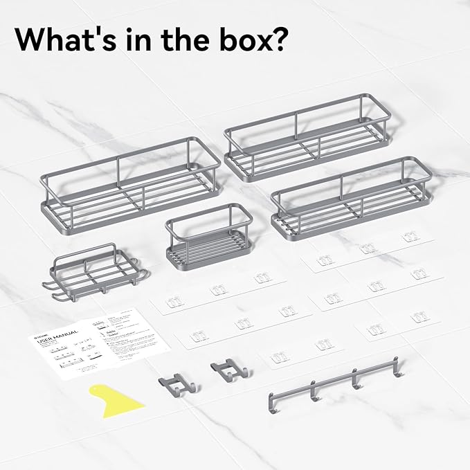 - 6 Pieces for Versatile Home Organization: The 6-piece bathroom shower shelves can be used not only in shower, but also in other cluttered areas at the same time, such as organizing spices in kitchen or cleaning supplies under sink, to keep everything in your home neat and tidy. And its sleek and modern look will add a touch of elegance to your family as a great home decor
