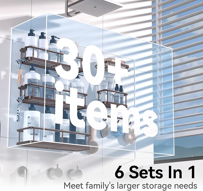 - Game Changer for Shower Storage: The 6-piece large capacity shower caddy set comes with 5 different storage solutions to match all your shower essentials, including large caddy X3 for large shampoo bottles, mini caddy X1 for small bottles, shower soap holder X1 for soap bar, little hook X 2 and a row of hooks for hanging razors, towels, loofahs and so on. It is a game changer for enhancing your bathroom space and simplifying your life