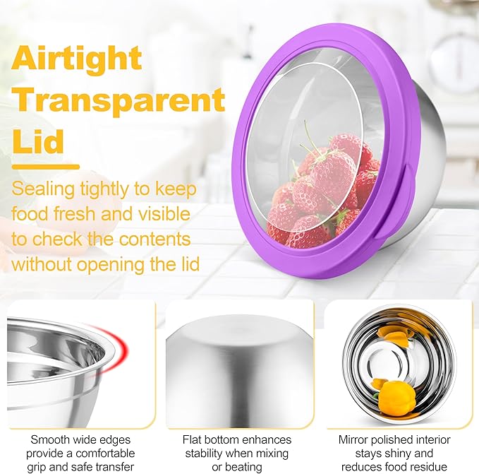 - VISIBLE & CLEAR LIDS: Every mixing bowl equipped with visible airtight lid, Allows you to effortlessly see-through the contents inside the bowl without opening, The silicone side of the lid completely wraps around the bowl for a tight seal, Locks the food freshness and prevents spillage or leakage, Suitable to be used in fridge or freezer, With raised lip on the lid for easy opening