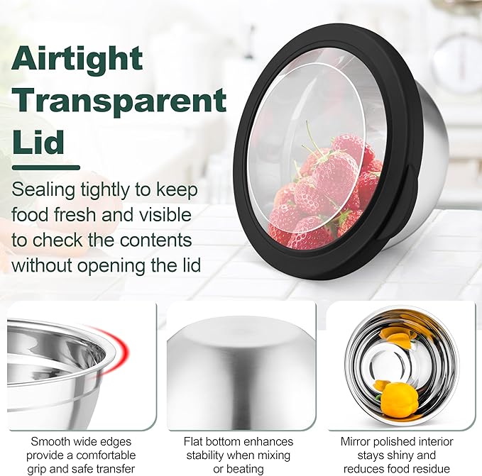 - VISIBLE & CLEAR LIDS: Every mixing bowl equipped with visible airtight lid, Allows you to effortlessly see-through the contents inside the bowl without opening, The silicone side of the lid completely wraps around the bowl for a tight seal, Locks the food freshness and prevents spillage or leakage, Suitable to be used in fridge or freezer, With raised lip on the lid for easy opening
