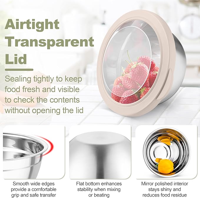 - VISIBLE & CLEAR LIDS: Every mixing bowl equipped with visible airtight lid, Allows you to effortlessly see-through the contents inside the bowl without opening, The silicone side of the lid completely wraps around the bowl for a tight seal, Locks the food freshness and prevents spillage or leakage, Suitable to be used in fridge or freezer, With raised lip on the lid for easy opening