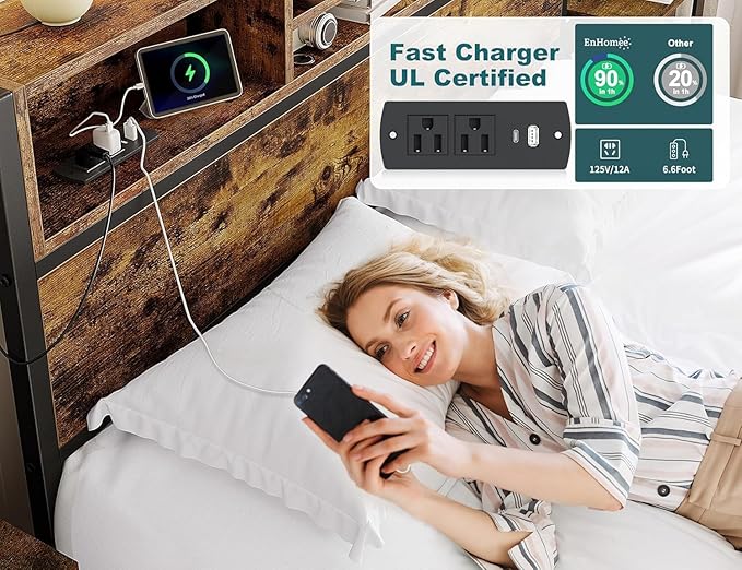 - 【44"H Storage Headboard with Fast Charging Station】King bed frame with storage is built-in obtained UL certification charging station which protect you and devices from short circuits and overpower problems, including 4 charging port and 6.6ft long power supply cord, you can charge various electronic devices within easy reach. Its fast charging design is born to improve charging efficiency-provides 20% faster power.