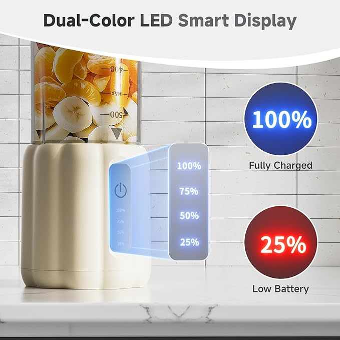 - 【Battery Protection Mechanism】If the juice or milkshake is viscous, it will cause the juicer to get stuck and display 25% power, which means the battery has entered protection mode. At this time, you need to connect the charging cable to charge and wait for 10s before using it