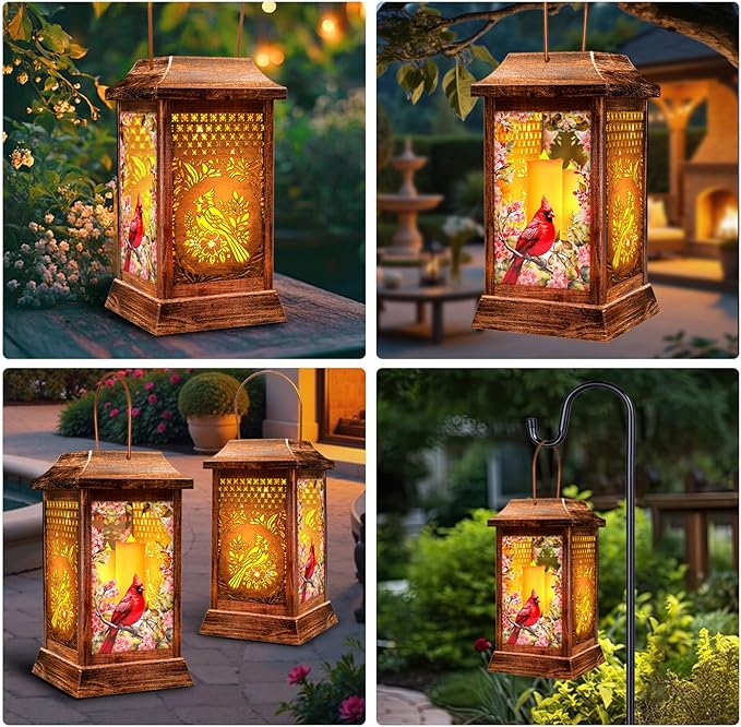 - 【Waterproof Metal Outdoor Lanterns】Designed for all-weather durability, waterproof, heat-resistant, and frost-proof, making these cardinal decor perfect for year-round use. Simply turn on the switch at the bottom, and let the sun do the rest, with no wiring or electricity needed. Easy to install and maintenance-free, the hanging garden decor is an effortless way to add enchanting lighting to any outdoor setting