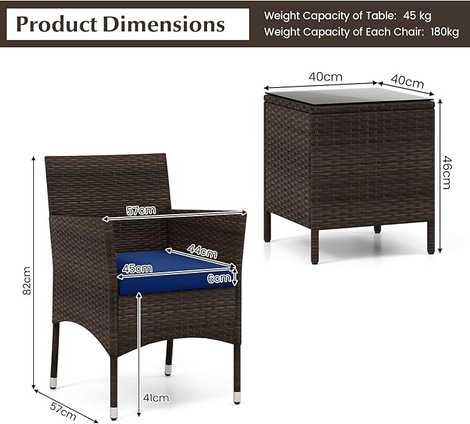 - Multi-scene Application: This 3-piece outdoor bistro set includes 2 armchairs and 1 coffee table. Modern style makes this set match perfectly with your outdoor space like porch, backyard, poolside. Dimension of Chair: 22.5" x 22.5" x 32" (L x W x H). Dimension of Coffee Table: 16" x 16" x 18" (L x W x H). Dimension of Seat Cushion: 18" x 17" x 2.5"(L x W x H).