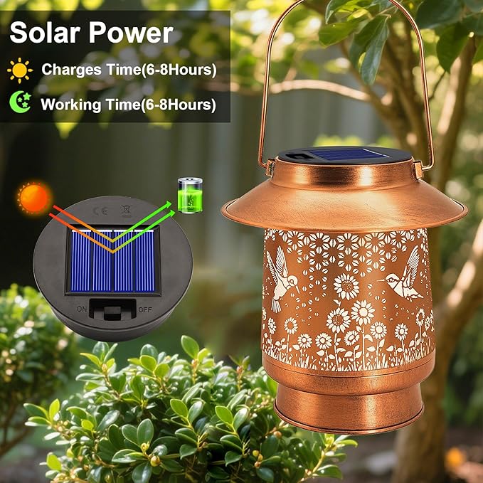 - Upgraded Solar Panel & Energy Efficiency: This solar garden lantern features a high-efficiency solar panel that fully charges in just 6-8 hours of sunlight. it combines elegant design with green technology, Equipped with an intelligent light-sensing system, it automatically illuminates at dusk, delivering 8-12 hours of soft, ambient lighting. The front-mounted switch allows easy operation without disassembling the lantern. Its weather-resistant design ensures durability in outdoor conditions.