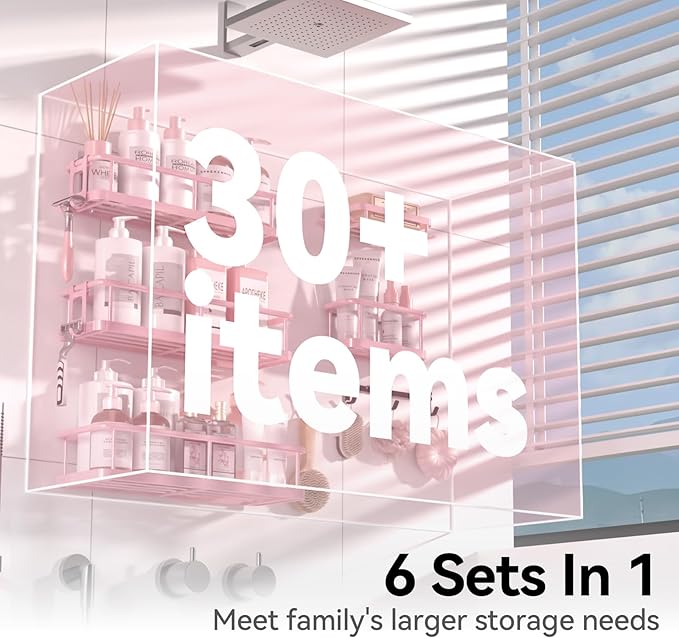 - Game Changer for Shower Storage: The 6-piece large capacity shower caddy set comes with 5 different storage solutions to match all your shower essentials, including large caddy X3 for large shampoo bottles, mini caddy X1 for small bottles, shower soap holder X1 for soap bar, little hook X 2 and a row of hooks for hanging razors, towels, loofahs and so on. It is a game changer for enhancing your bathroom space and simplifying your life