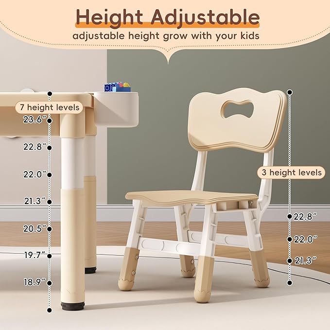 - Both Table & Chair Height-Adjustable:Ybaiwana toddler table and chairs are both height-adjustable. The dimension of the kids table is 34.7''L x 24.4''W. The height of the table is between 18.9'' and 23.6" and weight capacity up to 300 lbs. The chairs are available in three heights: 10.6", 11.4" and 12.2". So this is a great partner for your children growing up.