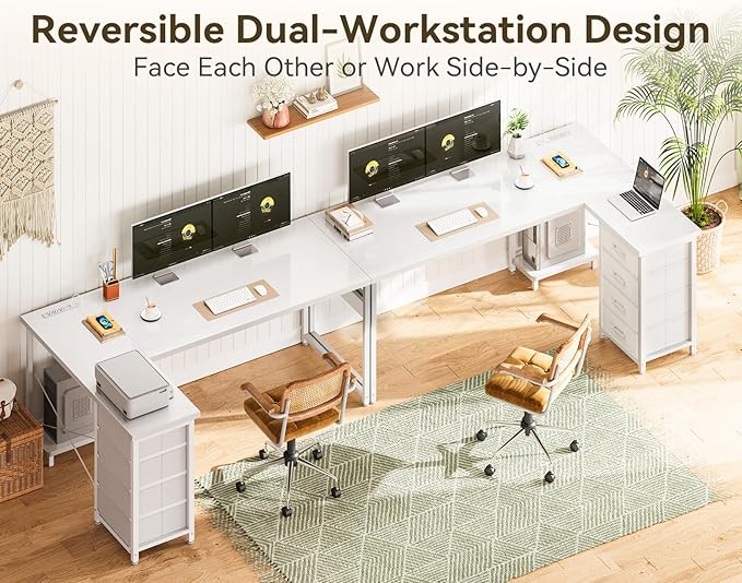 - 【Enhanced Storage & Organization】Featuring four roomy drawers and two reinforced metal hooks, this L-shaped workstation optimizes workspace efficiency by neatly storing documents, supplies, handiwork, and personal accessories. Its expansive surface accommodates printers, scanners, or dual monitors while maintaining a clutter-free environment.