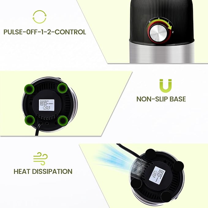 - 【STABLE AND SAFE WITH SUCTION CUPS】 – The motor’s bottom suction cup design provides added stability during blending. It firmly grips your countertop to prevent the blender from sliding or tipping over, keeping everything secure while you blend. This feature also helps reduce noise and vibrations, offering a smoother, quieter blending experience.