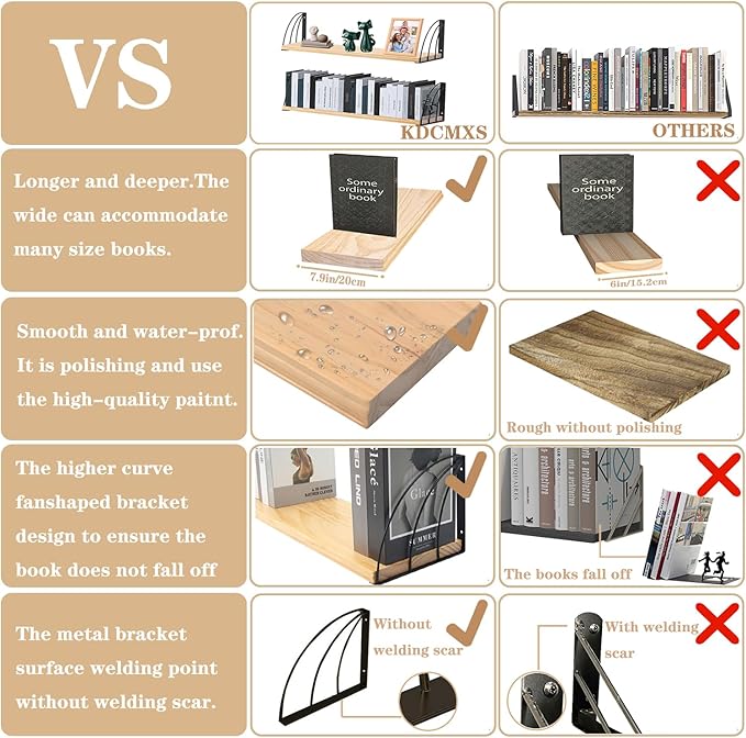 - ✅Prevents Book Sliding & Falling System—Engineered with a high curved bracket retention system, our natural wood floating shelves 36 inch securely keep books upright and organized—no more tilted stacks or scattered falls. Unlike basic triangular brackets of 36 inch wood floating bookshelves that compromise center-of-gravity stability, our ergonomic fan-shaped design locks books in place.