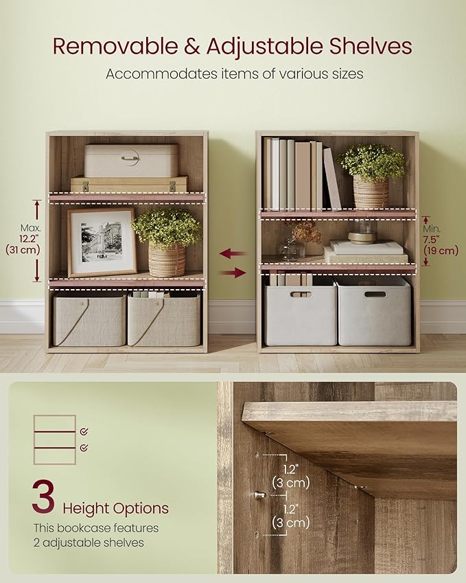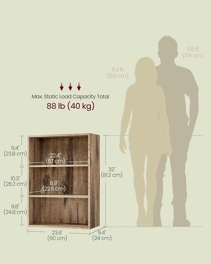 - 【SPACE-SAVING & ADJUSTABLE】This 3-tier bookcase, measuring 9.4"D x 23.6"W x 32"H, optimizes vertical space. The 2nd and 3rd tiers are adjustable to 3 heights (up or down 1.2"), easily accommodating tall books, artwork, or storage boxes