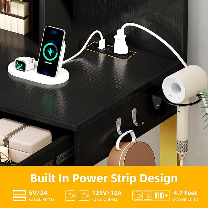 - Makeup Table with Charging Ports and Hair Dryer Holder: This makeup desk integrates a charging station for your beauty tools and a convenient holder for your hair dryer. With three color lighting modes and adjustable brightness, you can achieve flawless makeup application under optimal lighting conditions