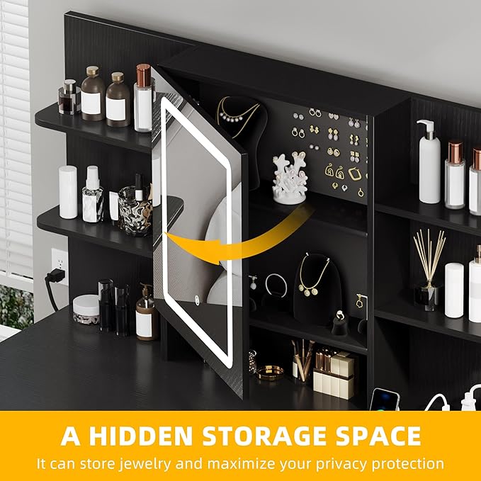 - Smart Storage Solutions with Hidden Compartments: Keep your beauty products organized and within reach thanks to the cleverly designed hidden storage spaces located behind the mirror. Combined with its durable construction and versatile lighting options, this makeup station is not only functional but also helps maintain a clutter-free environment