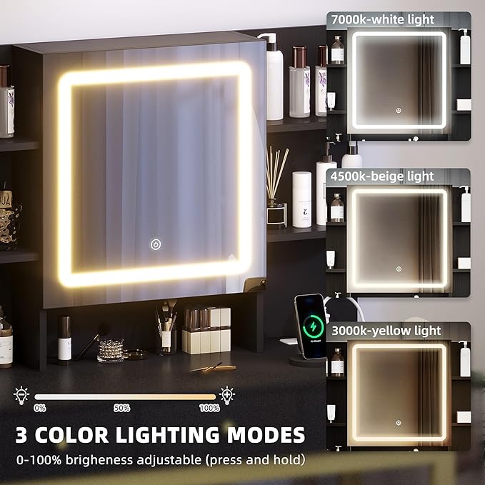 - Enhanced Lighting for Flawless Application: Featuring three distinct color lighting modes and adjustable brightness levels, this vanity desk allows you to perfectly match any indoor lighting condition, ensuring precise makeup application every time. Say goodbye to uneven lighting and hello to professional results at home