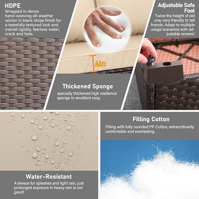 - Quality & Maintain: Delicate composite weaving with half-moon and round all-weather HDPE wicker material handwoven over fully-welded powder-coated steel framing makes outdoor patio furniture very durable and sturdy. Breathable 250G polyester Anti-UV and water-repellent fabric. Each piece is designed to withstand sunshine beating down and rainstorms rolling through.