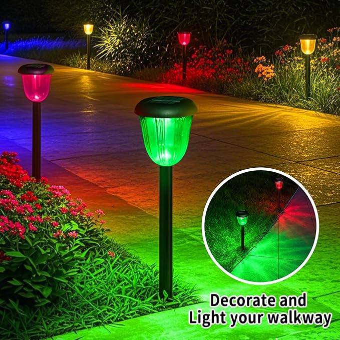 - Wide Appilcation and Easy to Install: These solar path lights is no wiring required, just assemble the parts together and insert stake into the soil to work. You can use solar path lights everywhere like garden, lawn, walkway, pathway, driveway or yard. The colourful light create a nice feeling when you take a walk with your family, friends. Our solar lawn lights are designed just for you to be easy to use. Enjoy your glowing garden with no maintenance for free!