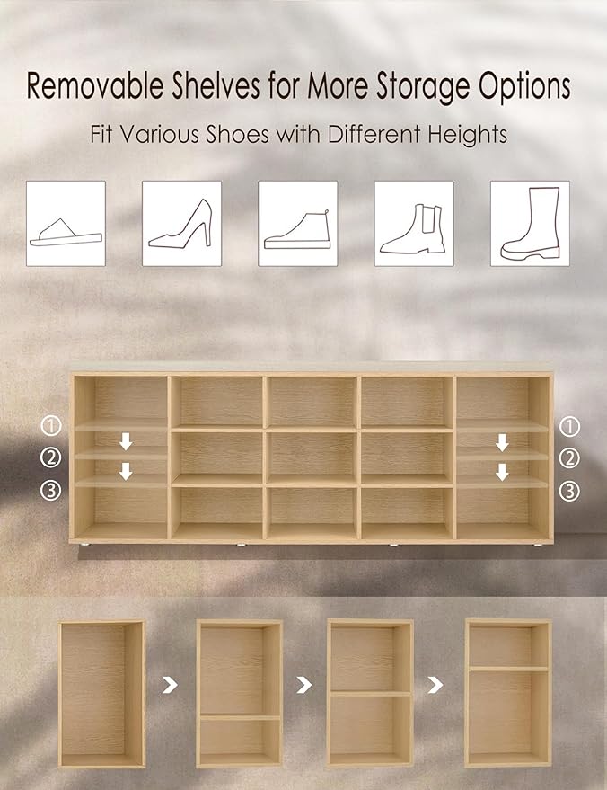 - 【Flexible for Multiple Needs】9 middle compartments are fixed for sneakers, high heels and sandals. The side compartments are adjustable and removable for slippers, tall boots or storage boxes. Use as an entryway bench, window seat or bedside bench to store blankets, books and toys in the living room and bedroom