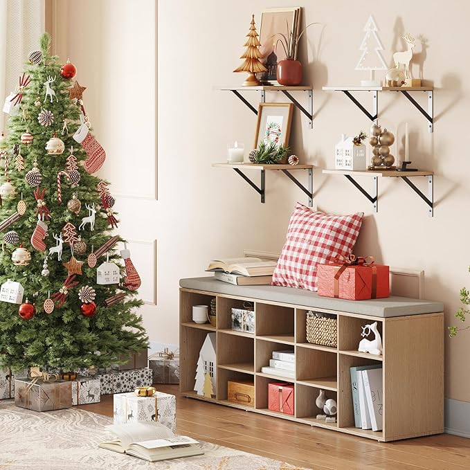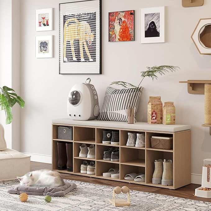 DINZI LVJ Shoe Storage Bench with Cushion, 15-Cubby Shoe Rack, Adjustable Shelves, Long Shoe Organizer Bench for Entryway, Mudroom, Hallway, Living Room, Bedroom and Garage, Natural