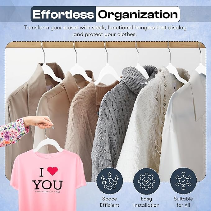 - 👚Versatile Use: Designed for adult hangers needs, these white plastic hangers 50 pack are suitable for various clothing types. From casual clothing hangers for shirts to heavier garments, they accommodate all wardrobe essentials.