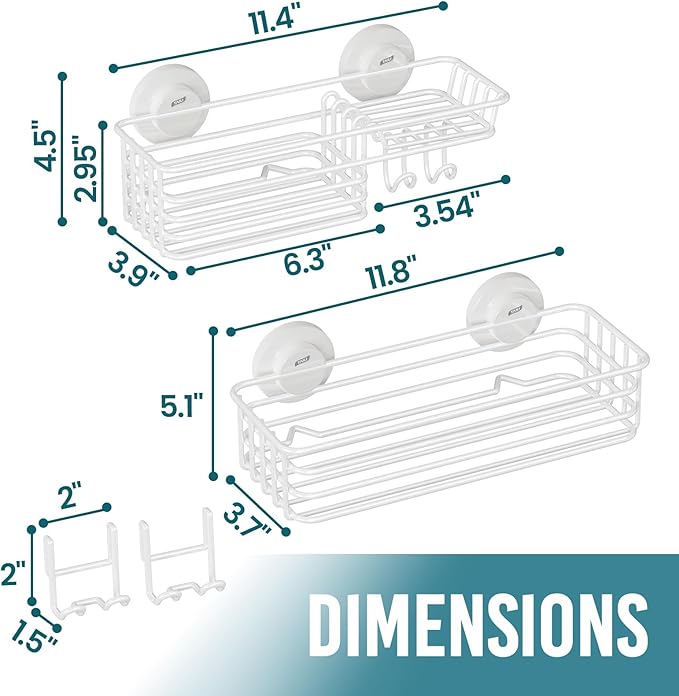 - Large Capacity & Multifuctional: Includes 2 shower shelves and 2 razor hooks. Shower holders are perfect for Bathroom, Kitchen and RV Storage, such as shampoos, conditioners, shower gels, facial cleansers, etc., and the hooks are fit for most size of razors, loofahs, shower brushes, etc., Shower caddy suction cups heavy duty help you save a lot of space