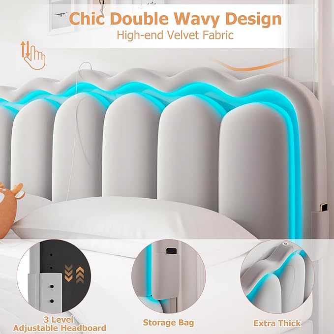 - SMART RGB LIGHTS WITH MUSIC SYNC: This king bed frame for kids with built-in RGB LED headboard transforms your bedroom with over 16 million colors, 20+ light effects, and dynamic modes controlled by app or remote. Bold lights sync with music, setting the ideal vibe for relaxing, reading, or entertaining. From gentle nightlight for kids to vivid party colors, this velvet bed frame makes every moment magical with immersive ambiance