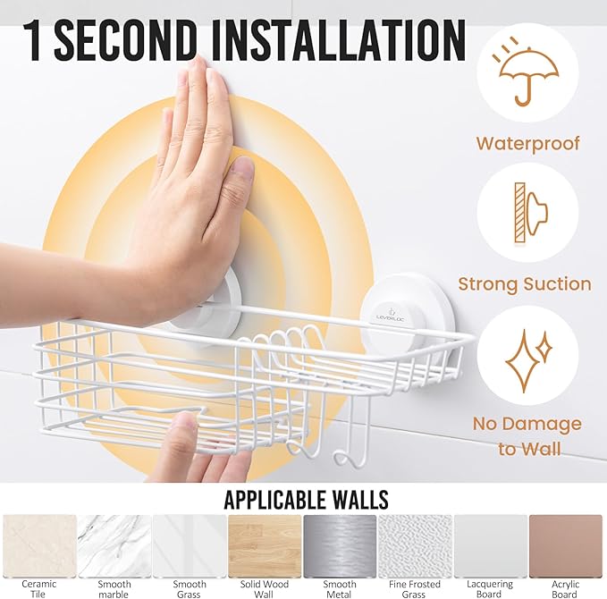 - One Second Installation & Remove : No drilling, No glue, No tools and No need to wait to apply the shower caddy. Simply choose a smooth and dry surface without any grout, take off the protective cover and push the board "PUSH" hard until you hear "PUFF", ONE second to complete the installation. The suction cup is removable without leaving any marks, so you can adjust height and position whenever you want