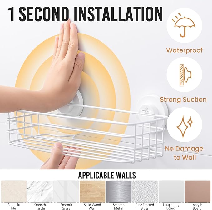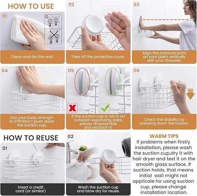 - One Second Installation & Remove: No drilling, no glue, no tools and no need to wait to apply the shower caddy. Simply choose a smooth and dry surface without any grout, take off the protective cover and push the board "PUSH" STRONGLY until you hear "PUFF", ONE second to complete the installation. The suction cup is removable without leaving any marks, so you can adjust height and position whenever you want