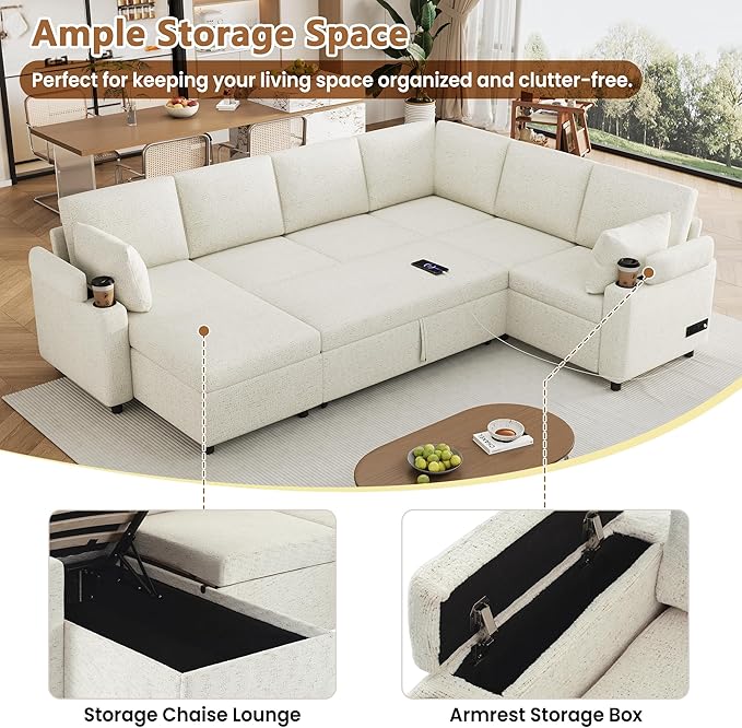 - [Convertible U-Shaped Sofa Bed] Designed with a pull-out bed mechanism, this sectional sofa seamlessly transforms into a spacious sofa bed, providing ample sleeping space for guests. The pull-out section is easy to operate with a built-in strap handle, allowing you to extend the bed effortlessly.With its combination of hidden storage and convertible functionality, this sleeper sofa is a smart choice for small apartments, studios.