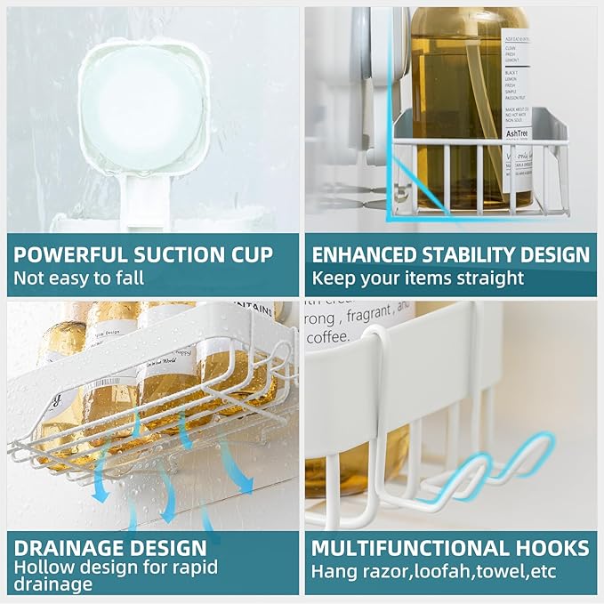 - Easy Installation & Removable: Simply press down the suction cups with palm to squeeze the air out, they will stick to the wall firmly. You can finish the installation in 1 second, and put your items in the bath organizer immediately without waiting 24h. No screws, no nails, no glue needed. Damage-free to your wall. Shower shelves can be re-positioned many times and removed without leaving sticky marks and residue