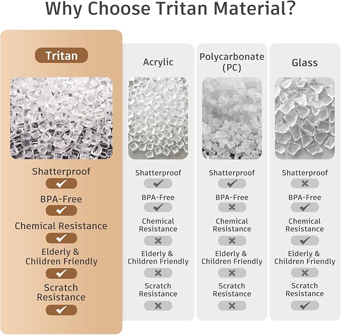 - Long Lasting Superior Quality Glasses: Our fancy Tritan glasses last longer than other plastic glasses, avoiding common problems found in other plastics such as cracking, clouding, and breaking down over time