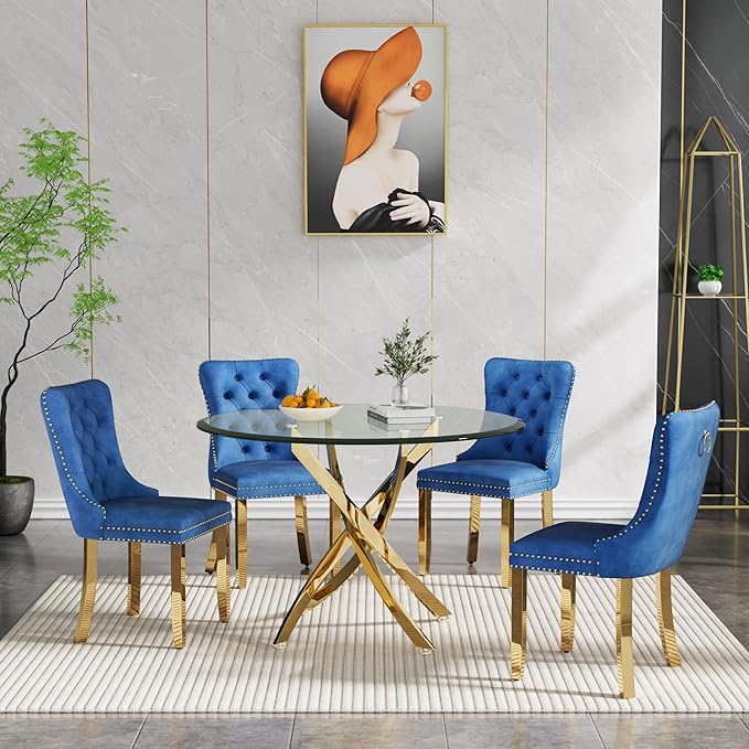 - Modern Round Dining Table - The combination of the sleek tempered glass tabletop and the stunning gold stainless steel cross legs creates an exquisite and sophisticated look that instantly elevates your dining area. This modern round glass dining table is ideal for any dining room set, giving a clean and polished look to dining room and is able to fit with any home Décor.