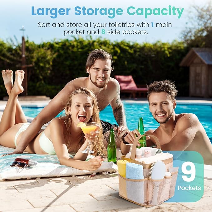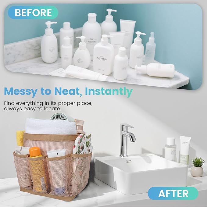 - Ample Storage with 9 Pockets:The spacious mesh shower caddy gets 1 large center pocket and 8 side pockets to store all the essentials. A middle pocket fits larger items like shampoo, towels, and hair dryers, while side pockets fit smaller items like toothbrushes, facial cleansers, and razors.