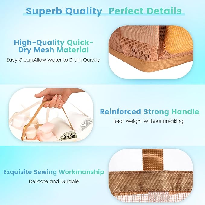 - Quick Drying, Effortless Cleaning:The shower caddy dorm will drain quickly and dry up naturally once it gets wet, due to the characteristics of breathable mesh fabric, preventing water buildup and odor. Directly rinse the mesh tote bag under the tap or use the washing machine instead.