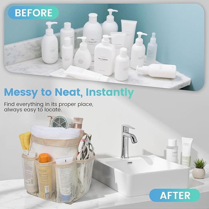 - Larger Capacity with 9 Pockets:The spacious mesh shower caddy gets 1 large center pocket and 8 side pockets to store all the essentials. A middle pocket fits larger items like shampoo, towels, and hair dryers, while side pockets fit smaller items like toothbrushes, facial cleansers, and razors.