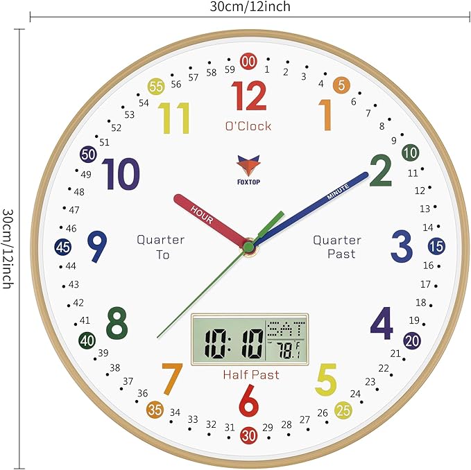 Foxtop Digital and Analog Learning Clock for Kids - Telling Time Teaching Clock 12 Inch Silent Non-Ticking Battery Operated Kids Wall Clock for Playroom Nursery Classroom School