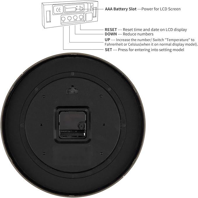 - Battery Operated: Please use 1 AA battery for the clock movement and 1 AAA battery for LCD digital display (not included). There is a user manual inside the packaging box, please read it carefully before using. Come with a hook, wide slot in back for easy hanging.