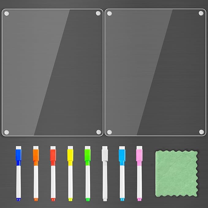 - Clear & Spacious Dual Boards: This magnetic blank memo board set includes 2 pack 9.5"x12" clear acrylic boards—perfect for meal planning, to-do lists, reminder or quick notes. With 8 vibrant chalk markers and 4 strong built-in magnets, these boards attach securely to your fridge, keeping your reminders front and center